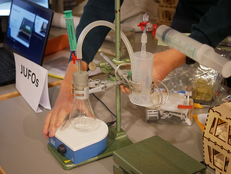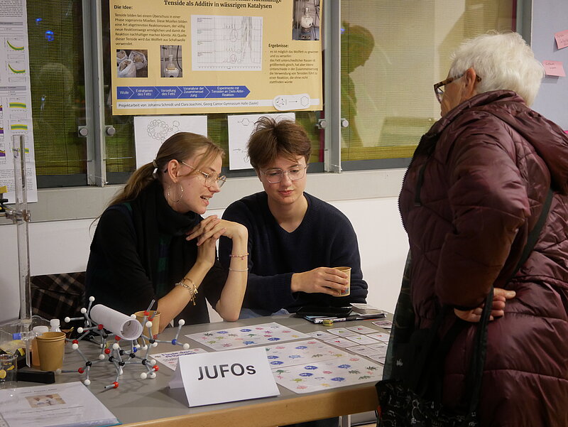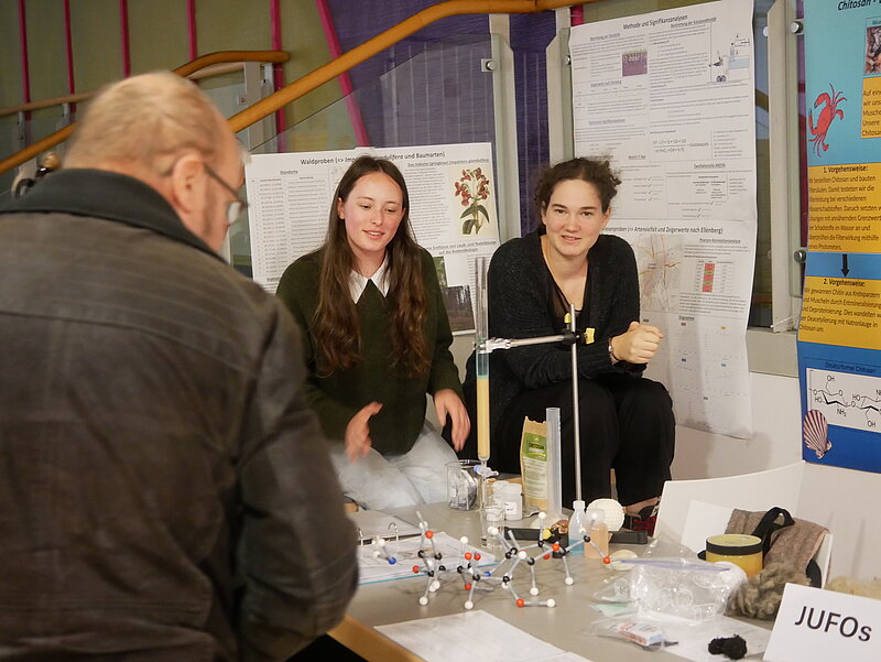 Zu sehen gab es außerdem eine Versuchsapparatur zur Bestimmung der Katalasezahl von Bodenproben, Untersuchungen zur Nutzung von Tensiden aus Schafwolle als nachhaltige Alternative für die Herstellung von beispielsweise Waschmittel, Präsentationen zu Autoimmunerkrankungen und deren Bekämpfung, ein Modell eines Tauchboots mit bionischem Flagellum-Antriebssystem, Studien zum Mikroklima in Seegraswiesen sowie Analysen von Temperaturdaten in Deutschland.
