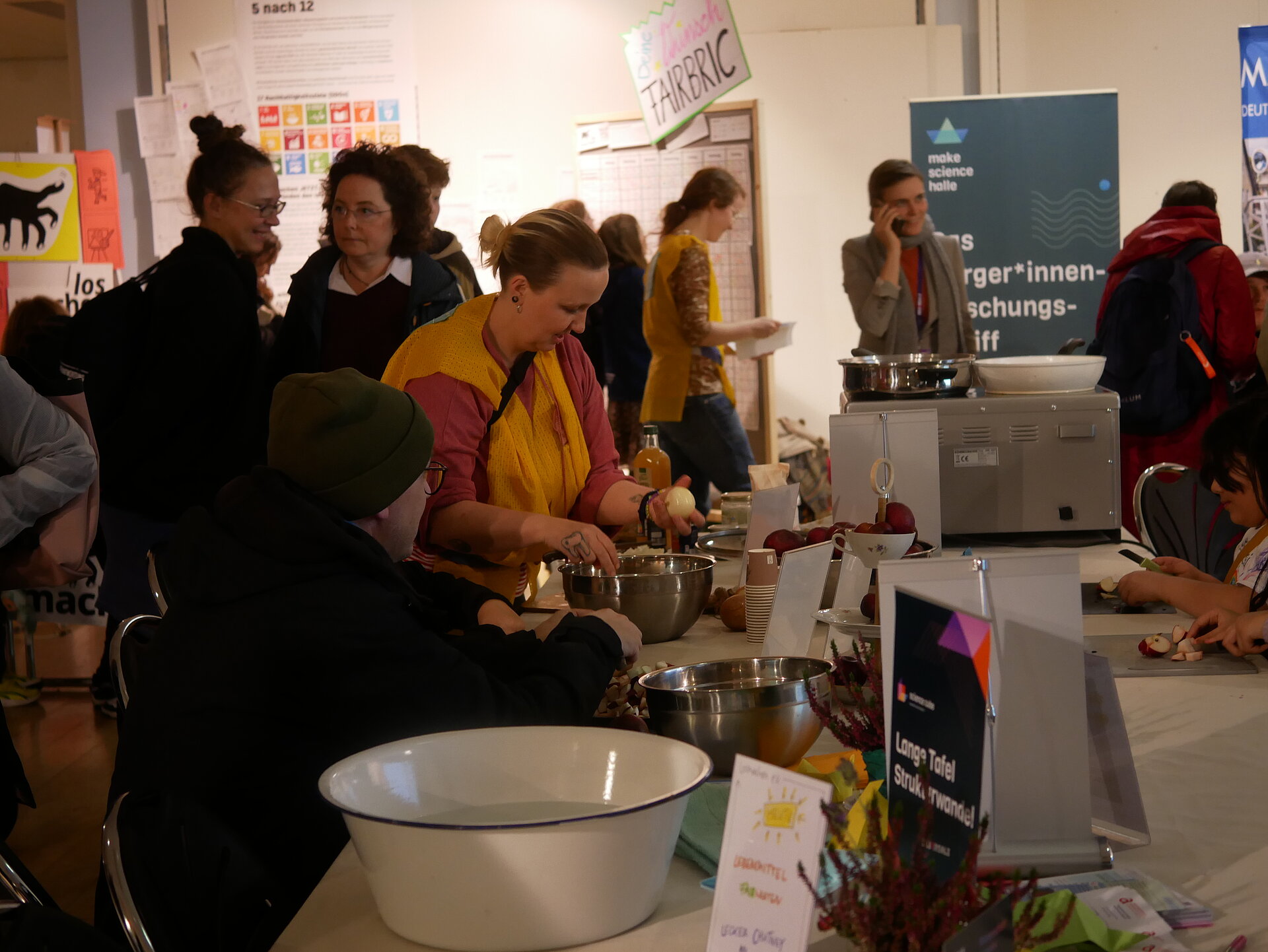 Zum Abschluss wurde es gemeinschaftlich und duftend: Unter dem Motto „Lebensmittel wiederFAIRwenden“ lud der losmachen e.V. dazu ein, beim gemeinsamen Schnippeln, Rühren und Würzen mitzumachen. Zusammen mit den Besucher*innen entstand ein würziges Apfelchutney mit Kokosfett, Ingwer, Chili, Kardamom, Apfelessig, Zucker und weiteren feinen Gewürzen.