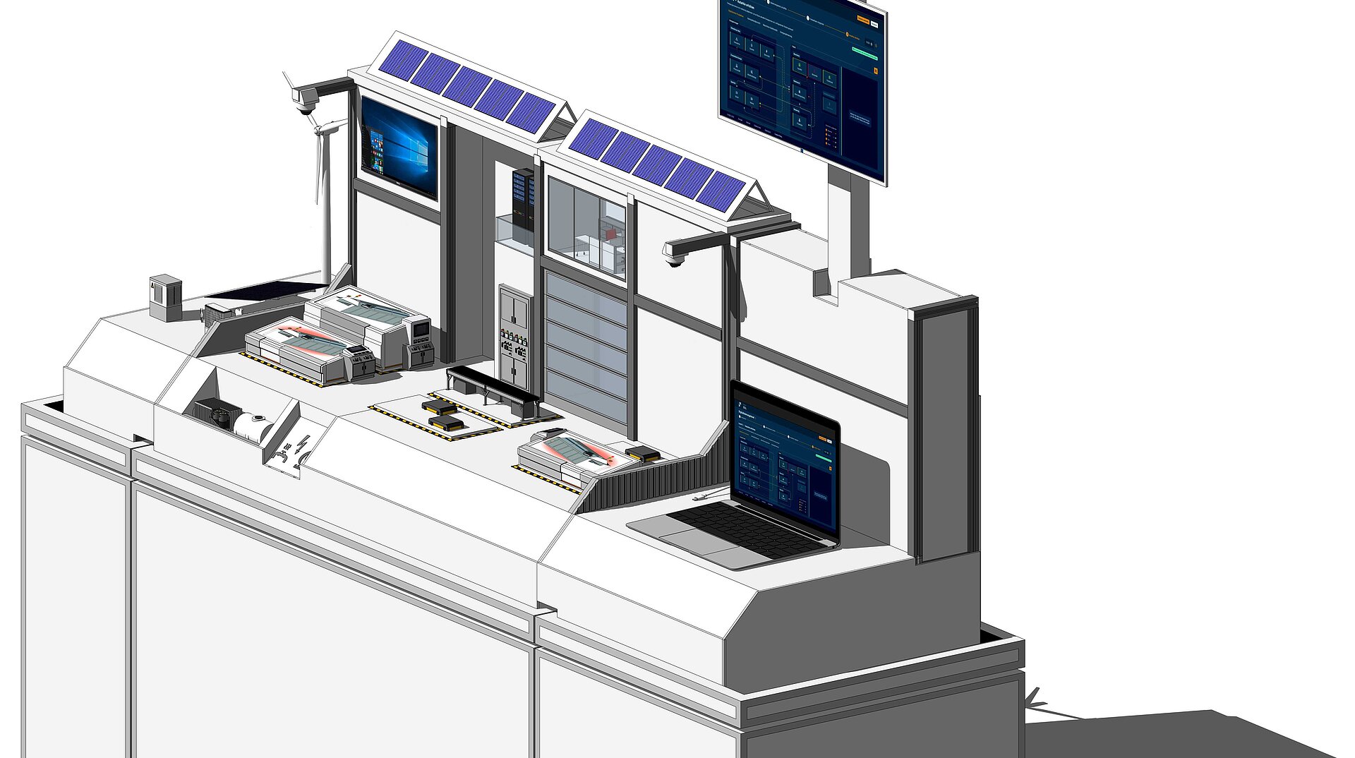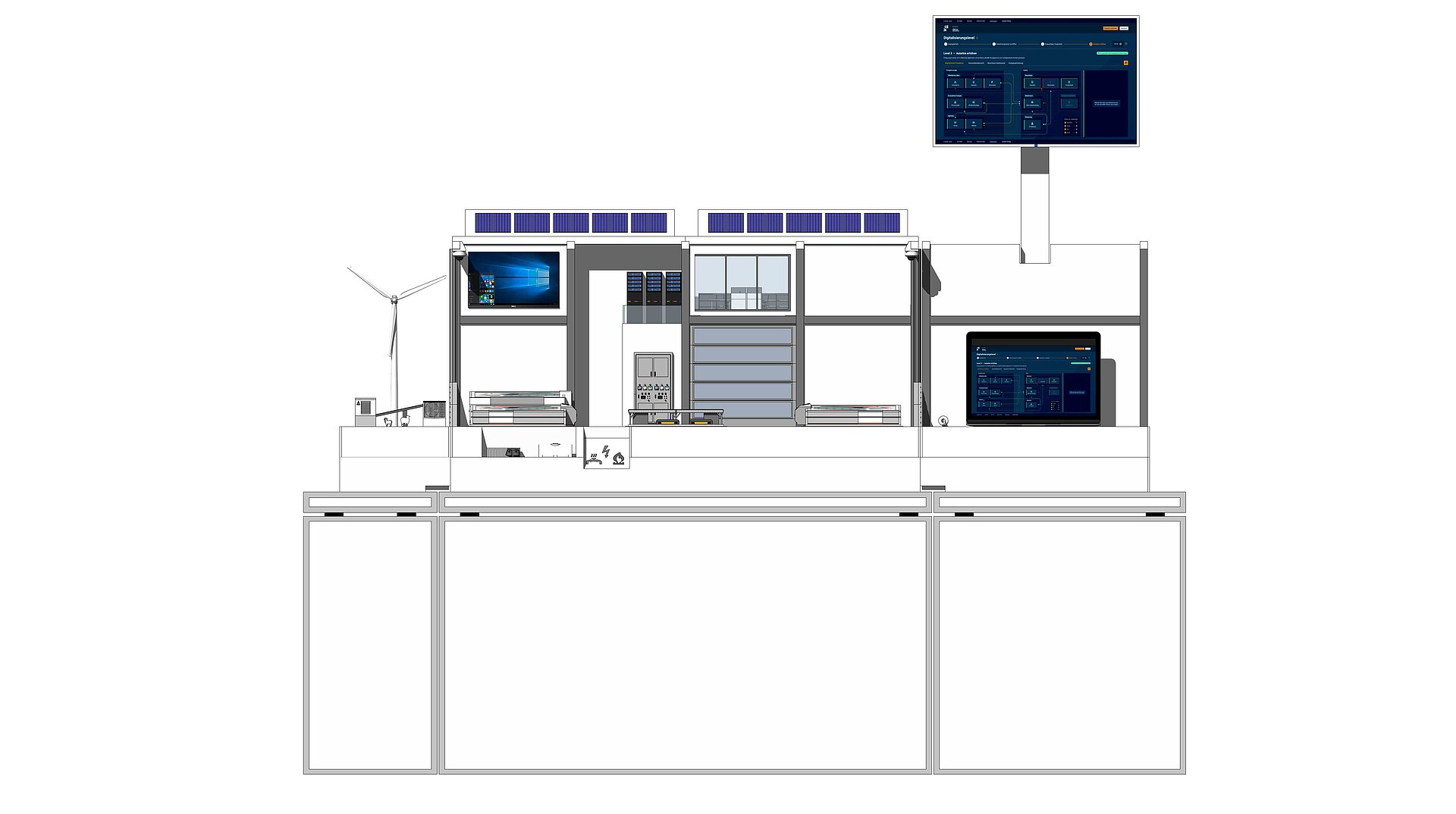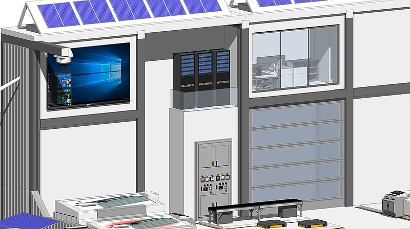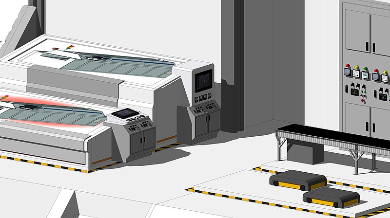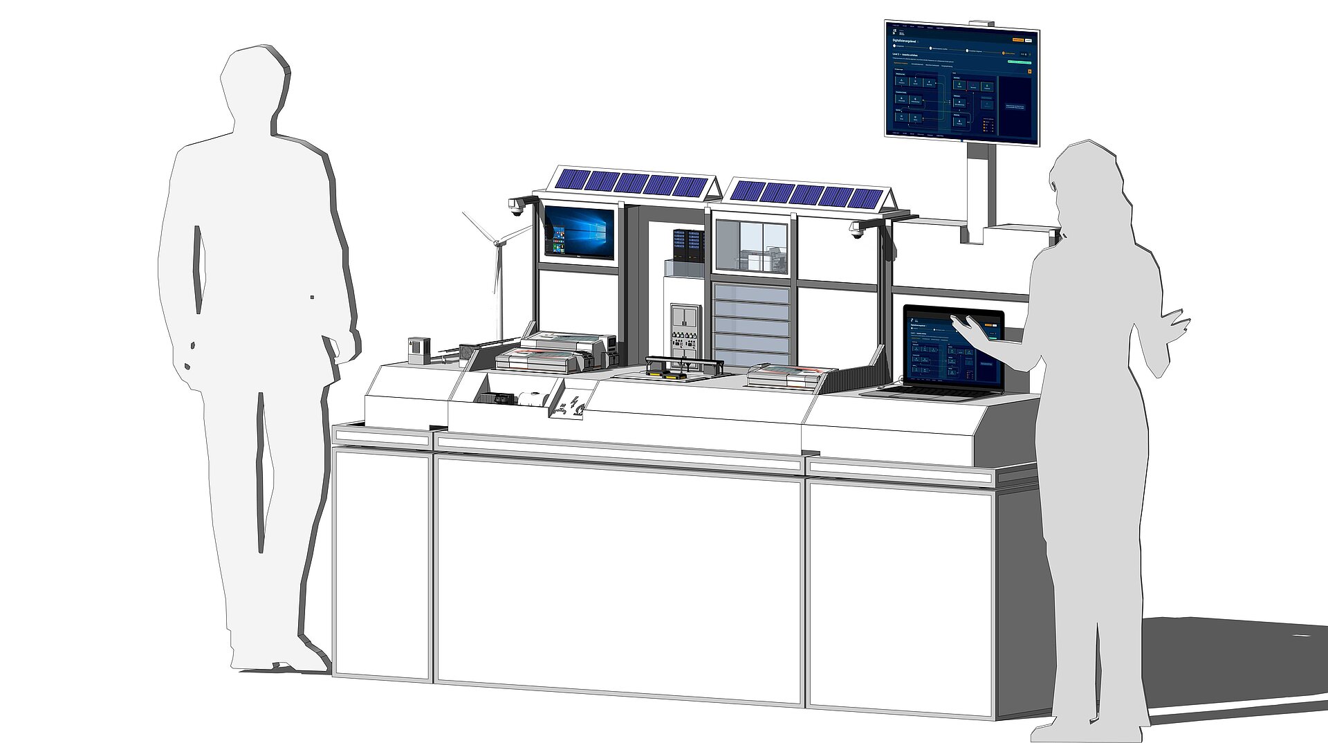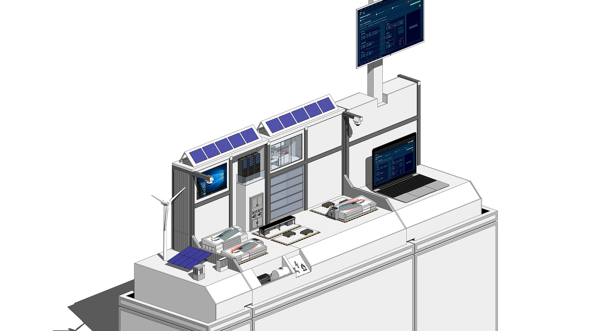 E2D2, das Modell eines industriellen Produktionsbetriebs mit angrenzender Peripherie, ist ein multidimensionales Werkzeug. Mit ihm können industrielle Vorgänge zu "Digitalisierung" interaktiv und anschaulich visualisiert und so für die Wissensvermittlung zugänglich gemacht werden. Ziel ist die Vermittlung eine grundlegenden Verständnisses zu den Herausforderungen der Digitalisierung in Betrieben.