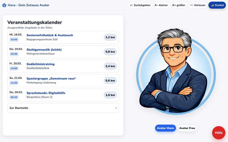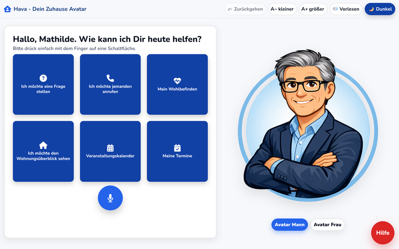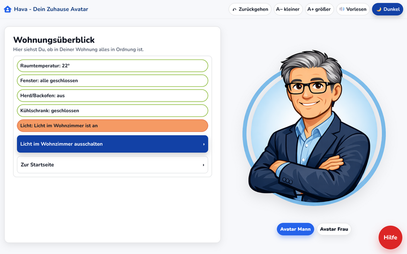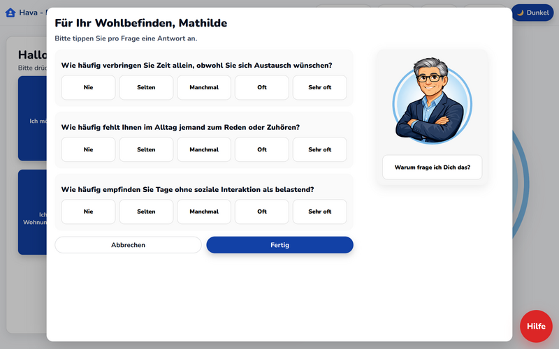 Im Projekt „PräEinsamAlt-KI“ wird in einer Modellwohnung ein System entwickelt, das Einsamkeit bei älteren Menschen erkennen und ihr entgegenwirken soll. Durch präventive Angebote und Vernetzungsmöglichkeiten unterstützt eine seniorengerechte Interaktionsoberfläche dabei, soziale Isolation zu vermeiden, die Selbstständigkeit zu erhalten und das Wohlbefinden zu stärken.