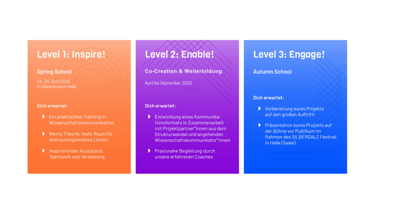 In der Praxisphase der Open Academy verbinden wir in drei Leveln Teilnehmer*innen mit innovativen Strukturwandelprojekten. Gemeinsam entwickelt ihr Kommunikationskonzepte, Medienproduktionen oder Beteiligungsformate, die für Wissenschaft begeistern und echte Impulse für die Transformation setzen!