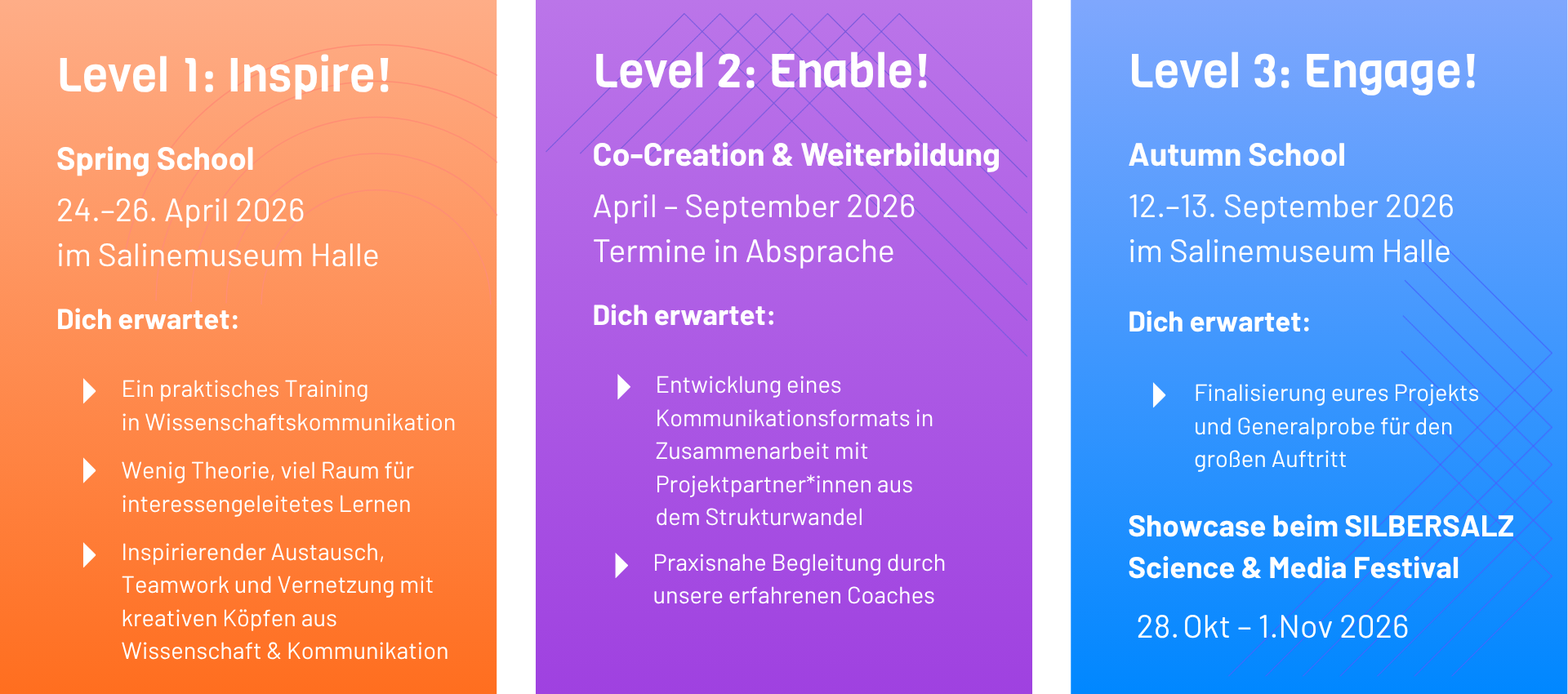 Diese beinhalten unsere Spring School, die Co-Creation-Phase mit dem Enable!-Programm und die Autumn School. Den Abschluss bildet eine feierliche Präsentation, bei der die Forschungsprojekte und entstandenen Kommunikationsformate in einem Science Slam beim SILBERSALZ Festival vorgestellt werden.
