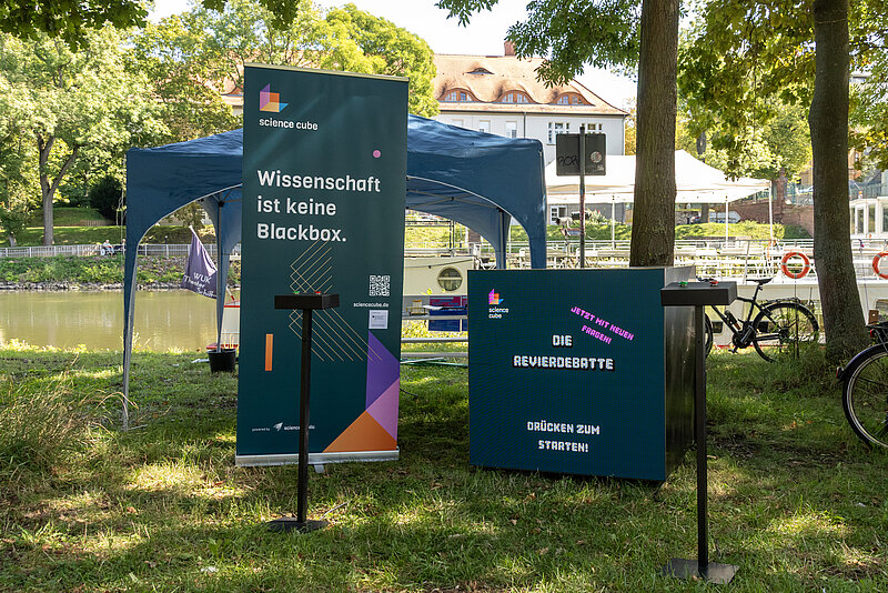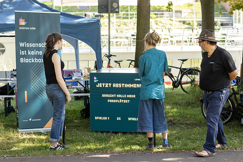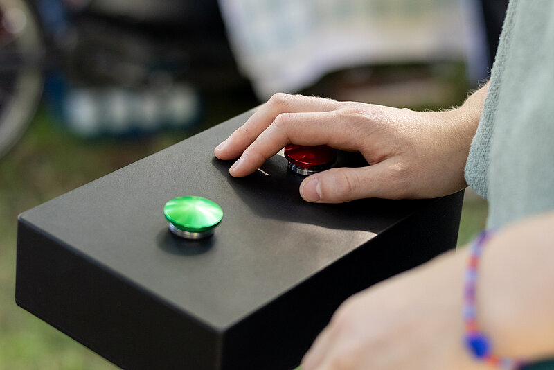 Die Revierdebattenbox ist ein interaktives Demokratie-Game aus dem Science Cube. Zwei Spielende beantworten per Buzzer provokante Ja/Nein-Fragen zum Strukturwandel. Bei Uneinigkeit beginnen 60 Sekunden Debattenmodus, nur wer einen Konsens findet, kommt weiter.